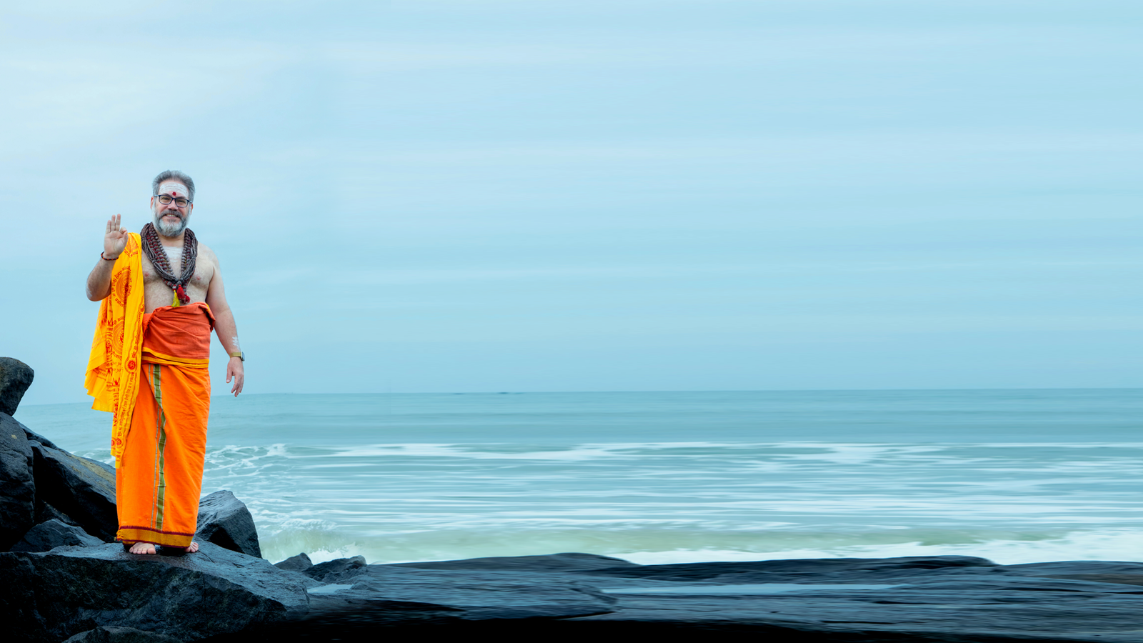 Balayogi walks upon the foaming, water-washed shore.